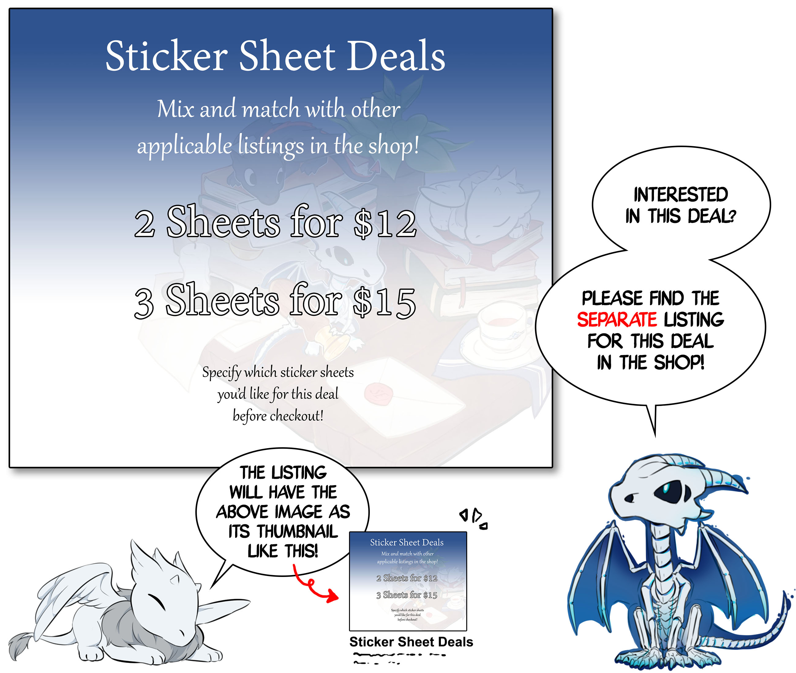 4x6 in. matte vinyl sticker sheet featuring the dragon trio--Drift, Ivor, and Hermann.