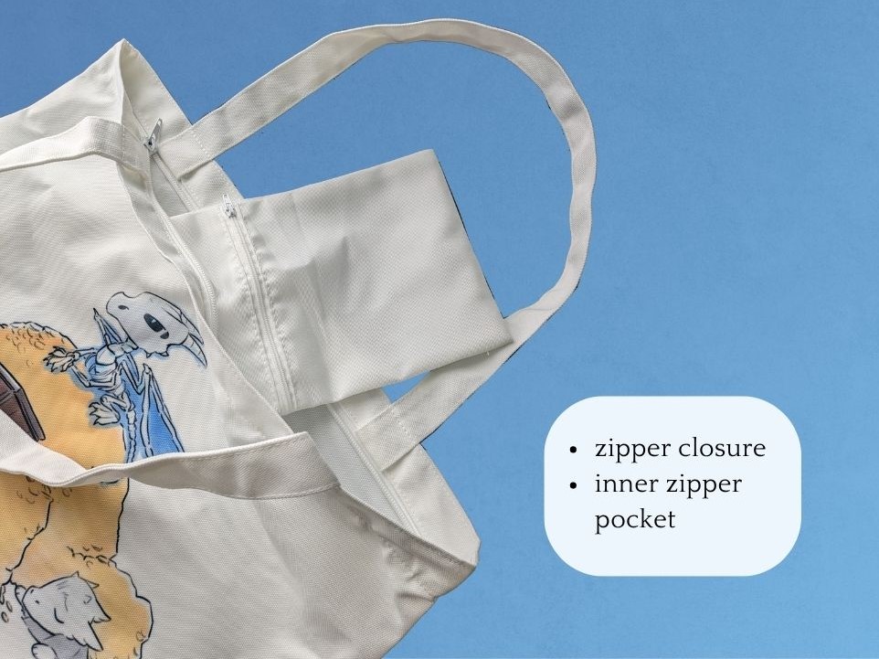 Original design featuring Silver Espada's mascots, the Dragon Trio. Tote bag features a double-sided design, a zipper closure, and a small zippered pocket inside the bag.